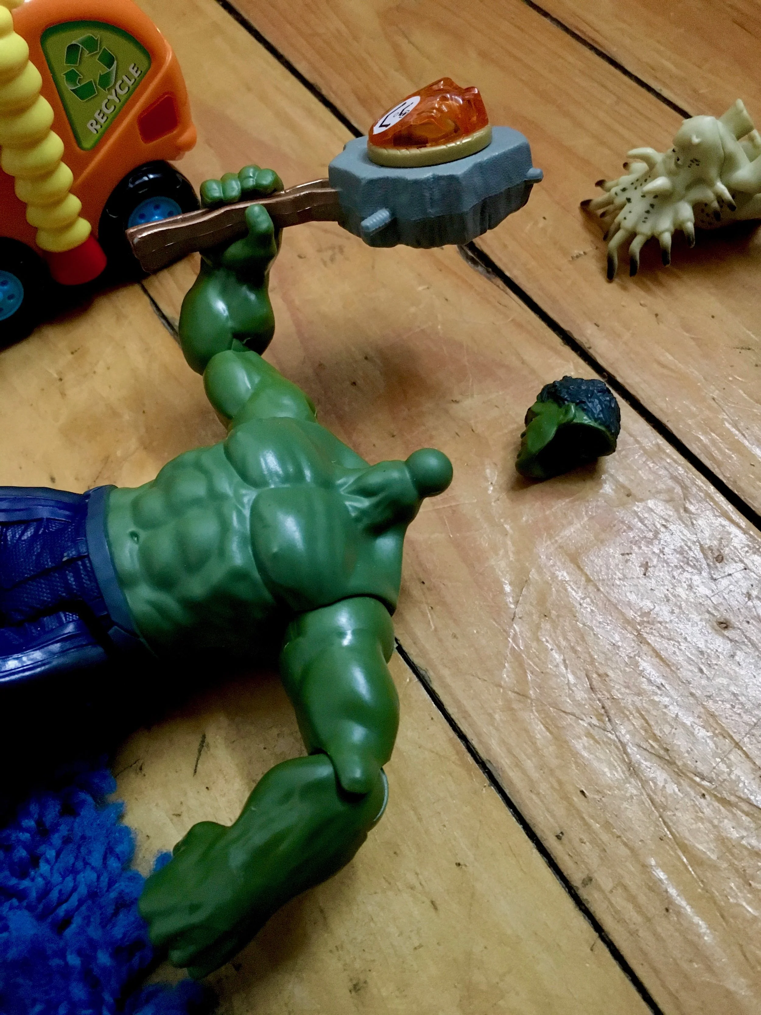 I didn't do this, it was Coco. I think he has a slight vendetta agains the Hulk. Must be jealous of his really big green body, or maybe his tiny head. Whatever it is, I am sure it is a valid problem that the 17 month old has. The head must come off.