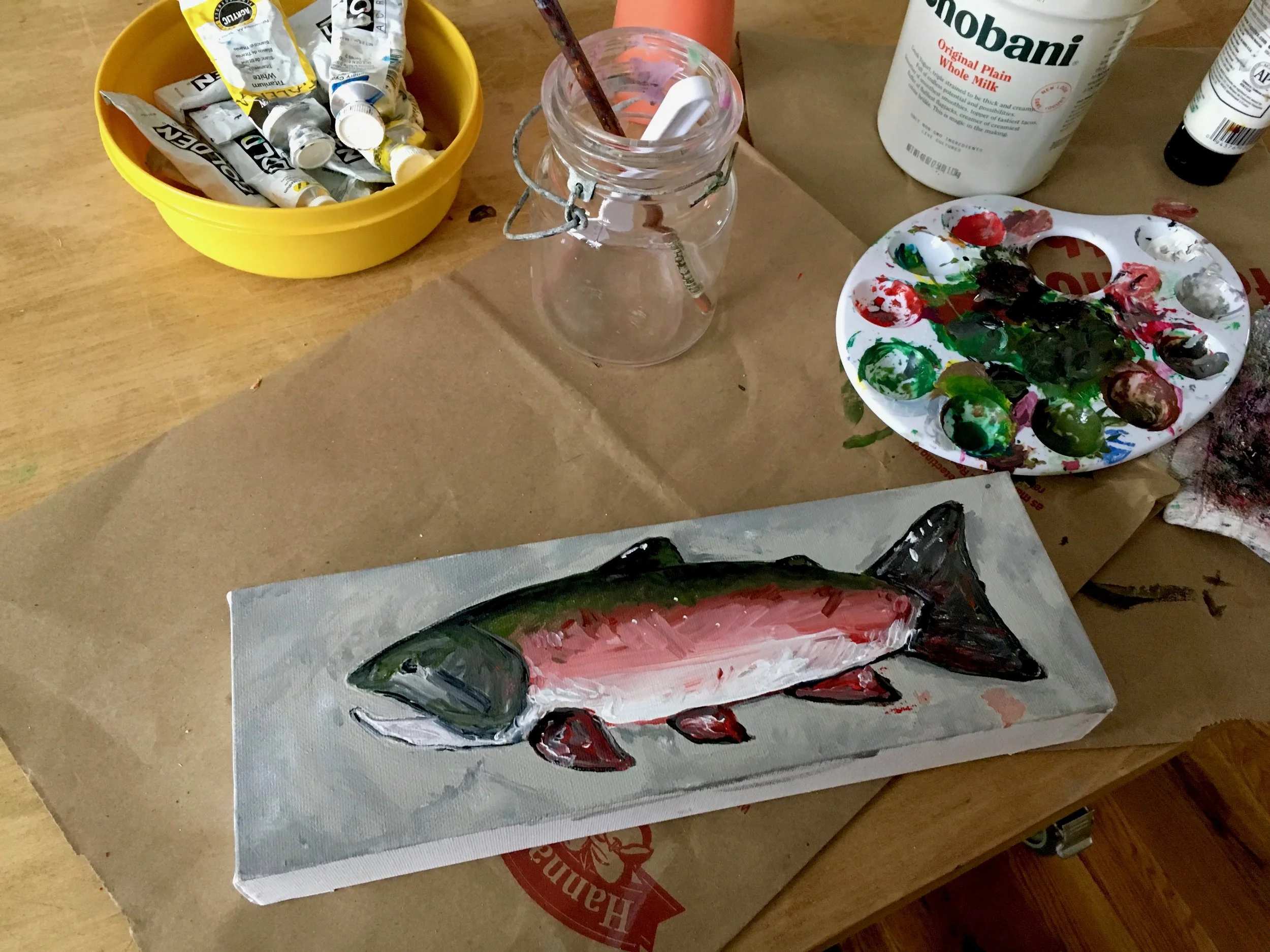 Other then the weather holding us back, we did accomplish somet things. We brough the new couch home (yay) but it is still sitting on the front porch awaiting the cleaning of it's life.I didn't get out to the garden this week, because ice and snow, but the seedlings are growing so well that I have upgraded their indoor soil dwellings to newspaper pots. We are still on a massive, ever more pressing hunt for a new faucet for the bathroom sink, and I have decided to go into business for myself making and selling sourdough bread and paintings of fish. (hit me uo if you need either) So yeah, we are doing things.